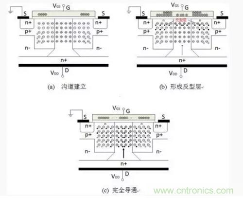 當MOS導通時,柵極和源極的電場將柵極下的P區反型,在柵極下麵的P區產生N型導電溝道,同時,源極區的電子通過導電溝道進入垂直的N+區,中和N+區的正電荷空穴,從而恢複被耗盡的N+型特性,因此導電溝道形成,垂直N+區摻雜濃度高,具有較低的電阻率,因此導通電阻低。