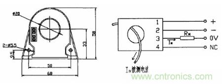 本係統選用的是宇森CBH100SF 型號的閉環霍爾電流傳感器。測量頻率是0-100KHz,額定電流100A,測量範圍:0-±150A,匝數比1:1000,精度0.2%-1%,相應時間:《lus。結構如圖3-3 所示: