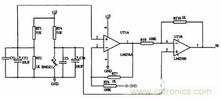 環境溫度的測量選用一種新穎的溫度傳感器LM35,其特點是輸出電壓與環境攝氏溫度成正比,集成電路內部己經校正,無需外部校正。靈敏度為10.0mV/℃,精度可達0.5℃,工作電壓範圍4V-30V,耗電極少,輸出阻抗低。自此使用LM35 滿量程[55℃,150℃]連接方法。為了防止零下溫度時,輸出負壓,不便於采樣到DSP 中,設計了一個減法器電路。調整為環境溫度在[-45℃,75℃]範圍內,輸出電壓是[0,4.5V]。