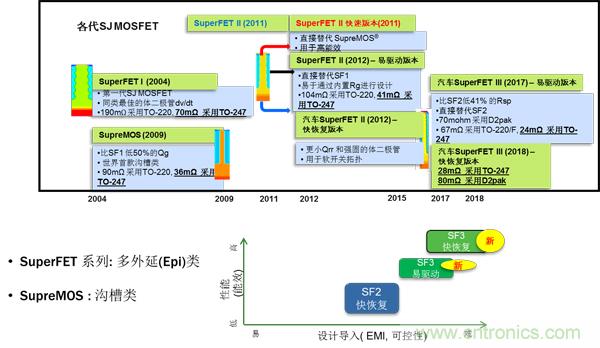 SJ MOSFET是利用電荷平衡技術實現出色的低導通電阻和低柵極電荷性能、從而最小化導通損耗並提供出色的開關性能的新型MOSFET。圖3所示為650 V SJ MOSFET技術演進。