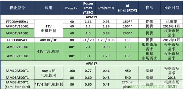 安森美半導體標準的APM19和APM17汽車模塊陣容如表4所示。