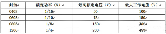 先來看看某廠家四種常用封裝電阻的參數表。其中表中有兩個值:額定工作電壓和最大工作電壓。