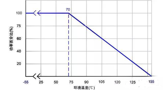 而最大工作電壓是在額定功率下,該電阻可以承受的最大電壓。但是要注意!看下麵這個圖。可以看出額定功率是在最高環境溫度70度的條件下標注的(不同廠家,係列可能有微小區別,在設計之初和問題查找的時候應該核實清楚。)