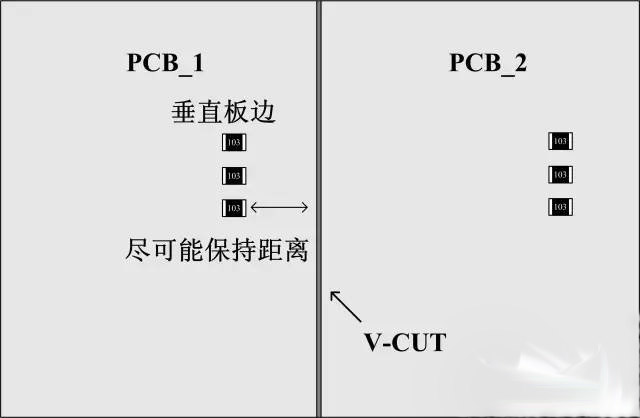 貼片電阻的另外一種常見的損壞是機械損傷後呈開路狀態,後續導致電路異常(器件外觀有可能正常)。下麵是幾個小建議:1、如果是手折板的話(極少使用,無法機器分析,毛刺大),貼片電阻長度方向平行於PCB板邊,零件受的應力小;如果是V-CUT的話,貼片器件長度方向垂直於PCB邊,零件破裂可能性較小。2、元件如果與連接處垂直,到連接處的距離建議要≥4mm,若平行,距離建議要≥1.5mm.3、在成本允許的情況下,適當加厚PCB板厚度,特別是麵積比較大的板子。(下麵是兩個簡單的示意圖,實際情況請實際分。)