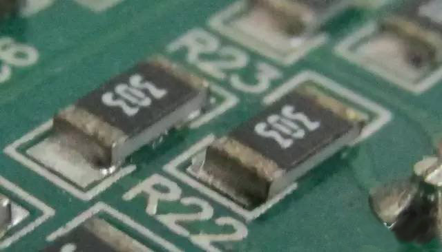 下圖是兩顆電極氧化了的貼片電阻(電極表麵有點黑),別看它們現在好好的,一旦電路進入了惡劣的工作狀態(高溫高濕),電阻就會因為虛焊而使電路工作在不可預測的狀態,繼而損壞。