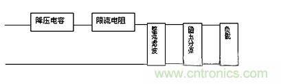 電路由降壓電容,限流,整流濾波和穩壓分流等電路組成。1.降壓電容:相當於普通穩壓電路中的降壓變壓器,直接接入交流電源回路中,幾乎承受全部的交流電源U,應選用無極性的金屬膜電容(METALLIZED POLYESTER FILM CAPACITOR)。2.限流電路:在合上電源的瞬間,有可能是U的正或負半周的峰_峰值,此時瞬間電流會很大,因此在回路中需串聯一個限流電阻,以保證電路的安全。3.整流濾波:有半波整流和全波整流,與普通的直流穩壓電源電路的設計要求相同。4.穩壓分流:電壓降壓回路中,電流有效值I是穩定的,不受負載電流大小變化的影響,因此在穩壓電路中,要有分流回路,以響應負載電流的大小變化。