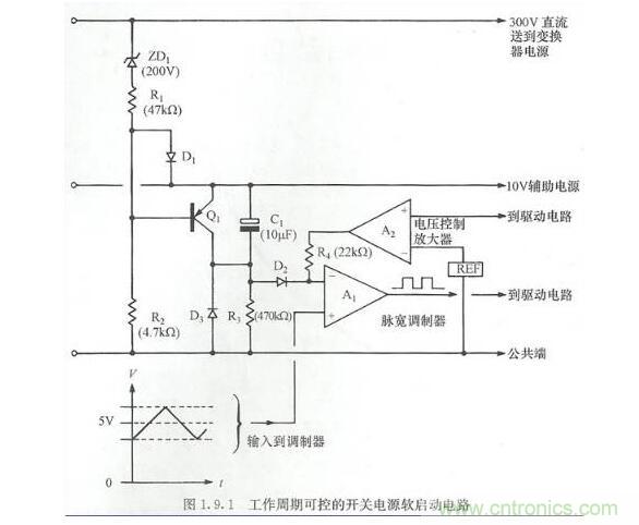 此時ZD1將開始導通,而Q1將關斷。C1將通過R3充電,使A1的反相輸入端電壓拉向零狀,並允許脈寬調製器的輸出向驅動電路提供逐漸增大寬度的脈 衝,直到形成所需的輸出電壓。 當正確的輸出電壓建立後,放大器A2控製了放大器A1反相輸入端的電壓。C1將繼續通過R3充電,使二極管D2反向偏置並使C1不再受調製器的影響。當 開關電源關斷後,C1將很快地通過D3放電,為下一次的啟動動作重新設置C1.在輸入電壓較高時,D1可防止Q1被大於正向二極管壓降的電壓反向偏置。