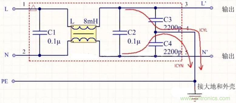 其中兩條紅線是火線和零線N的共模幹擾電流回路,稱為漏感電流回路。