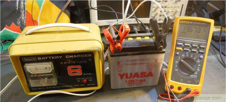 圖8:充電器在摩托車電池上施加了合適的13.67伏電壓。