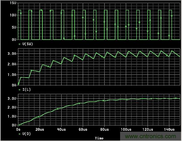 由於0 < D < 1,很明顯電路可以作為一種分壓器,不管負載RL所需的電流如何,公式(1)都保持不變。最初,電感電流的一大部分對C進行充電,電路一旦達到穩定狀態,電容電流將平均為零,因此電感提供的平均電流IL等於負載要求的平均電流IO。在上麵的例子中,IL= IO= VO/RL= 3A。