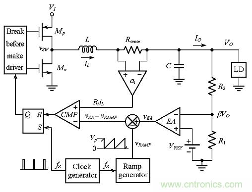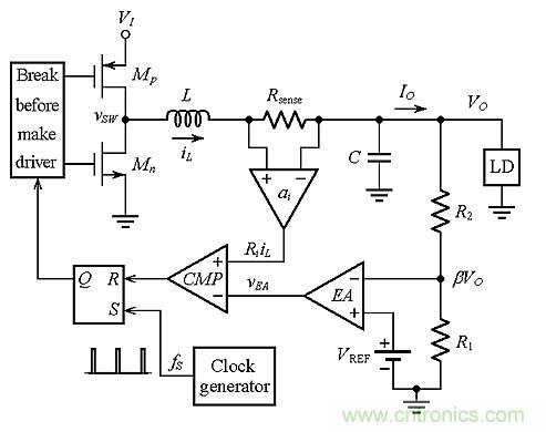 控製器如何調整D?控製器有兩類:電壓模式和電流模式控製器。下麵將討論電流模式控製器下麵的一個常見類型——峰值電流模式控製(PCMC),圖3是它的一個示例。為感測電感電流iL,電路使用一個小串聯電阻Rsense,其壓降由具有ai增益的放大器放大。該放大器將iL轉換成電壓RiiL,其中: