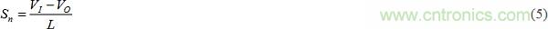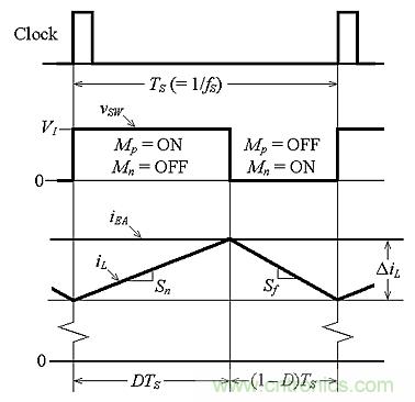 當一個時鍾脈衝置位觸發器時,開始一個周期。這將關閉Mp開關,使vSW=VI。在該周期的這一部分(在圖4中表示為DTS),電感器電流iL以斜率Sn上升,由iL-vL電感法則掌控,或Sn=diL/dt=vL/L。在這段時間,我們得到vL=VI– VO,所以: