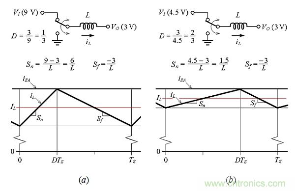 圖3所示電路存在兩個缺陷。第一個缺陷如圖5所示,是將VO調節為3.0V的轉換器設計(為簡單起見,假設周期在t = 0時開始)。圖4a示出了在VI=9V條件下,穩態電感器電流iL和其平均值IL,對應於D = 3/9 = 1/3的占空比。假設現在VI下降到4.5V,則對應D = 3 / 4.5 = 2/3的占空比。假設vEA沒時間發生顯著變化,那麼平均電感器電流iL將增加,如圖5b所示。這是因為當下坡Sf在-3/L保持恒定時,上坡Sn從(9-3)/L減小到(4.5-3)/L,即從6/L減少到1.5/L。