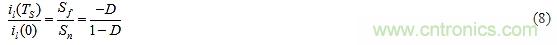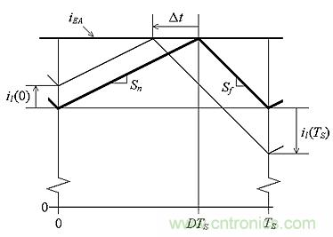 這樣,我們僅以電流形式就可以顯示一個周期,如圖4所示。現在,複位觸發器打開Mp開關,同時關閉Mn開關,使vSW= 0。在表示為(1–D)TS的周期其餘部分,我們有vL=0–VO,所以iL以Sf的斜率下降,因此有: