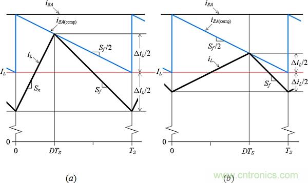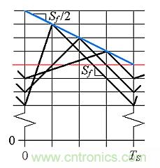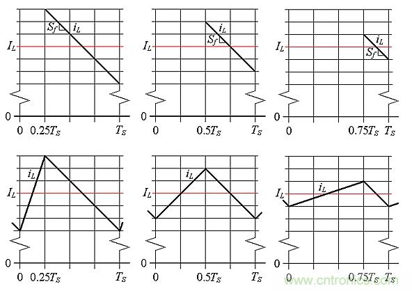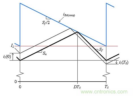 回來看圖5,我們觀察到,如果希望圖5b保持與圖5a相同的iL值,需要減小圖5b的iEA值,以便“下壓”iL波形,直到各IL對齊。那麼, iEA需要減到多少呢?為了回答這個問題,需要畫出三個不同D值所需的iL波形。如圖7所示,我們從頂部繪製iL的下降斜坡開始,以相同的IL為垂直中心,並且全具有相同的斜率Sf=-VO/L。接下來,通過繪製上行斜坡來完成iL波形,如圖7底部所示。最後,將這三張圖疊加,如圖8所示,並觀察到峰值軌跡斜坡的斜率為Sf/2 = –VO/2L。