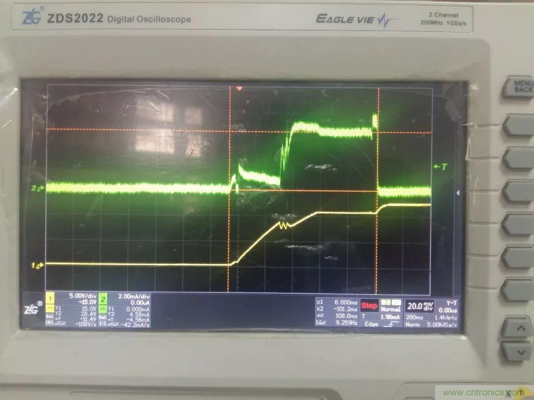 如下圖3所示,為圖2電路的實驗波形圖,綠色為IE電流波形,黃色為VDD電壓波形(示波器采用zlgZDS2022)。從圖中可看出開關電源啟動可分三個階段,第一階段,在上電時IE以近似1mA的電流向電容C充電,當VDD電壓達到UCC28C40門限電壓時進入第二階段,此時飽和電流增加至5mA,在為IC供電的同時繼續為電容充電,當輸出電壓建立後進入第三階段,此時IE電流為零,啟動電路停止工作,VDD電壓上升至輔助繞組電壓。在啟動的整個過程中,IE的電流都是比較小而且比較平緩,所以該電路安全可靠。