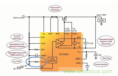 LTC7000 能夠避免負載遭受 VIN 引腳上的過壓和欠壓情況的損壞。“一個連接在 VIN 和地之間、且抽頭連接至 RUN 和 OVLO 引腳的簡單電阻分壓器將設定一個針對負載的有效操作窗口。當 VIN 位於由 RUN 和 OVLO 引腳所設定的操作窗口之外時,則關斷外部 MOSFET,並保護負載免遭潛在損壞或發生故障。” Mark Mullen這樣談到。