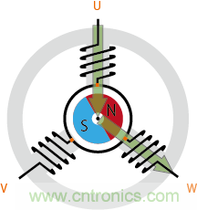 從U相向W向通電。首先,隻關注線圈U部分,則發現會產生如箭頭般的磁通量