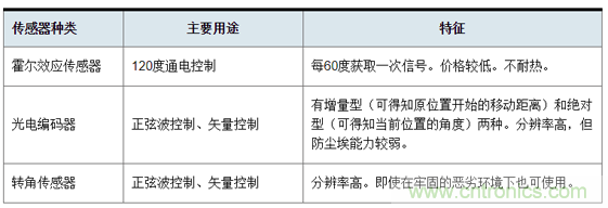表1中顯示的是BLDC電機主要的位置檢測用傳感器的種類。根據控製方式的不同,需要的傳感器也是不同的。在120度通電控製中,為判斷要對哪個相通電,配備了可每60度輸入一次信號的霍爾效應傳感器。另一方麵,對於精密控製合成磁通量的“矢量控製”(在下一項中說明)來說,轉角傳感器或光電編碼器等高精度傳感器較為有效。