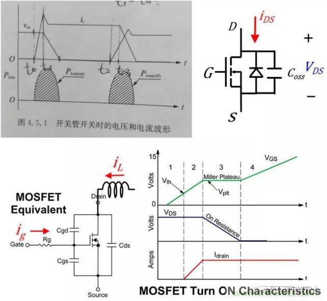 這裏就用MOSFET代替BJT了,所以ids = ic,Vds=Vce,Coss也就是Cds代表輸出電容。簡單來說就是當MOS管一開始導通時輸出電容Coss還保持Vds電壓,隨著Ids電流越來越大,Vds電壓終於保持不住,開始下降。直到管子完全開啟。比較詳細的開啟過程是由Miller Plateau造成的,這裏借用了網上一些解釋Miller Plateau的圖,如果有不清楚的就請見諒了。