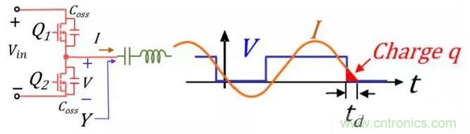 這是因為如果電流I是滯後與電壓V的,這樣在Q1開啟之前電流I為負值就會charge Q2的Coss,同時discharge Q1的Coss,讓V到Vin,這樣Q1就實現ZVS turn on了。Q2開啟之前,電流I為正,也會discharge Q2的Coss,和charge Q1的Coss,讓V到0,這樣Q2就實現ZVS了。