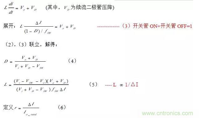 此值一般為常量。從(5)式可以得到:電感值越大,I就越小,因此r就越小。但這往往導致需要一個很大的電感才能辦到,所以絕大部分的Buck型開關電源選擇r值在0.25~0.5之間。