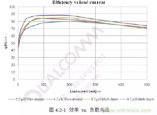 而大容量的電感具有較低的紋波電流和紋波電壓,較低的AC和傳導損失,在輕載時有較高的效率。圖4-1-1所示是Taiyo Yuden三種 2518封裝不同容量大小的電感負載電流跟效率的關係曲線。