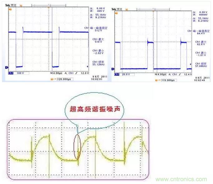 超高頻諧振噪聲主要來源於高頻整流二極管反向恢複時二極管結電容、功率器件開關時功率器件結電容與線路寄生電感的諧振,頻率一般為1~10MHz,通過選用軟恢複特性二極管、結電容小的開關管和減少布線長度等措施可以減少超高頻諧振噪聲。