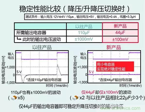 該升降壓電源,可實現業界最優異的無負載時消耗電流8µA,並以44µF輸出電容容量實現輸出電壓波動僅±100mV的穩定工作(消耗電流比普通產品低70%,輸出電容容量減少50%),因此非常有助於配備怠速啟停功能的車輛等在短時間內輸入電壓發生顯著下降的應用實現穩定工作以及進一步節能。