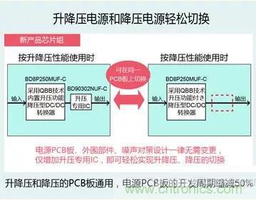 該芯片組融入了Quick Buck Booster技術,從而可實現以往無法實現的升降壓電源和降壓電源的電源PCB板、外圍部件、噪聲對策的通用設計。