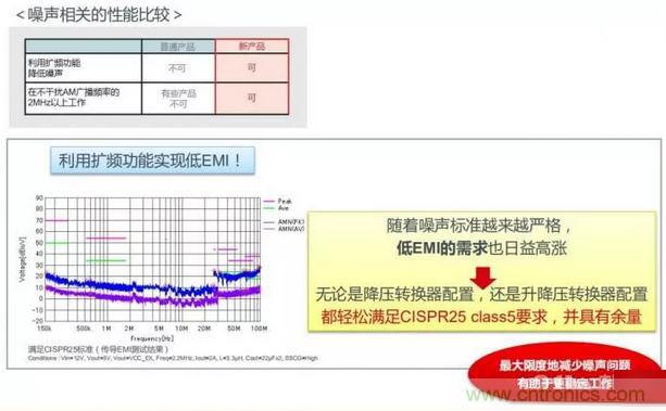 而且,同時實現車載ECU電源所需的“低電磁幹擾性能”和“高電壓輸入、低電壓輸出,不幹擾AM廣播頻段”,有助於對噪聲性能要求高的車載係統穩定工作。