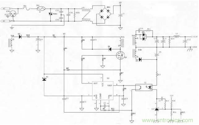 3843是PWM IC的一種,由Photo Coupler (U2)回授信號控製Duty Cycle的大小,Pin3腳具有限流的作用(最高電壓1V),目前所用的3843中,有KA3843(SAMSUNG)及UC3843BN(S.T.)兩種,兩者腳位相同,但產生的振蕩頻率略有差異,UC3843BN較KA3843快了約2KHz,fT的增加會衍生出一些問題(例如:EMI問題、短路問題),因KA3843較難買,所以新機種設計時,盡量使用UC3843BN。