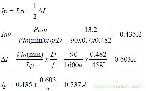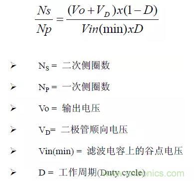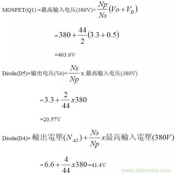 依據變壓器的圈比關係,可以初步計算出變壓器的應力(Stress)是否符合選用零件的規格,計算時以輸入電壓264V(電容器上為380V)為基準。