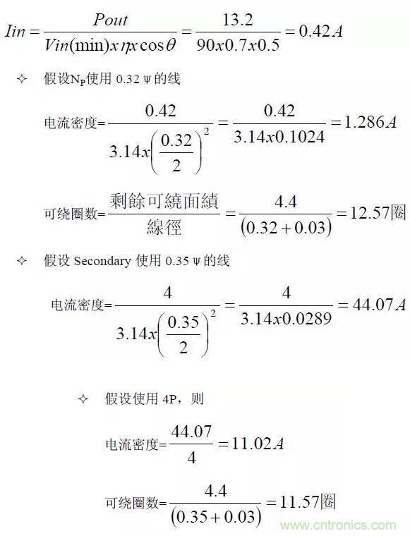 當變壓器決定後,變壓器的Bobbin即可決定,依據Bobbin的槽寬,可決定變壓器的線徑及線數,亦可計算出線徑的電流密度,電流密度一般以6A/mm2為參考,電流密度對變壓器的設計而言,隻能當做參考值,最終應以溫升記錄為準。