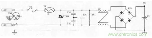 Y-Cap一般可分為Y1及Y2電容,若AC Input有FG(3 Pin)一般使用Y2- Cap , AC Input若為2Pin(隻有L,N)一般使用Y1-Cap,Y1與Y2的差異,除了價格外(Y1較昂貴),絕緣等級及耐壓亦不同(Y1稱為雙重絕緣,絕緣耐壓約為Y2的兩倍,且在電容的本體上會有“回”符號或注明Y1),此電路因為有FG所以使用Y2-Cap,Y-Cap會影響EMI特性,一般而言越大越好,但須考慮漏電及價格問題,漏電(Leakage Current )必須符合安規須求(3Pin公司標準為750uA max)。