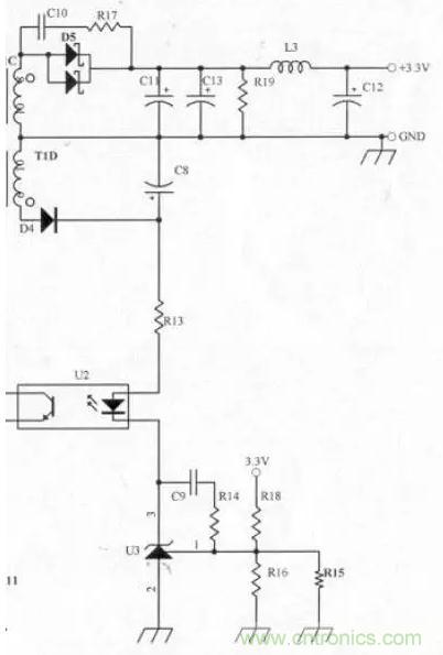 因為輸出電壓為3.3V,而輸出電壓調整器(Output Voltage Regulator)使用TL431(Vref=2.5V)而非TL432(Vref=1.25V),所以必須多增加一組繞組提供Photo coupler及TL431所需的電源,因為U2及U3所需的電流不大(約10mA左右),二極管耐壓值100V即可,所以隻需使用1N4148(0.15A/100V)。
