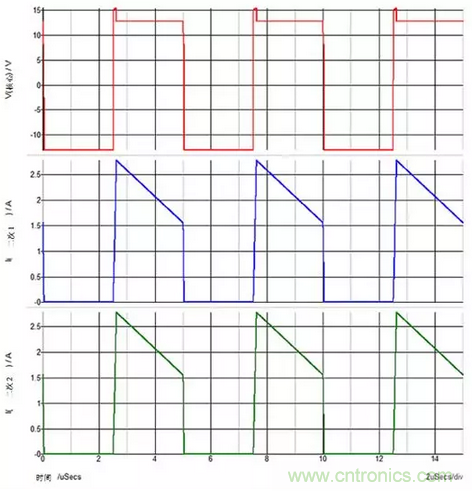 例如,一個反激式電源可分別從一個48V輸入產生兩個1 A的12V輸出,如圖1dejianhuafangzhenmoxingsuoshi。lixiangdeerjiguanmoxingjuyoulingzhengxiangyajiang,dianzukehulvebuji。bianyaqiraozudianzukehulvebuji,zhiyouyubianyaqiyinxianchuanliandejishengdiangancainengjianmo。zhexiedianganshibianyaqineideloudiangan,yijiyinshuadianluban(PCB)印製線和二極管內的寄生電感。當設置這些電感時,兩個輸出相互跟蹤,因為當二極管在開關周期的1-D部分導通時,變壓器的全耦合會促使兩個輸出相等。