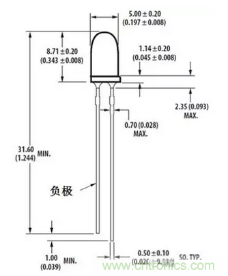 其次,也可以通過引腳的長短來判斷正負極,引腳短的那一邊是負極,如下圖所示。
