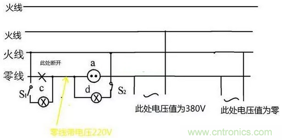 給出草圖當零線斷開時,如過上端負載有未斷開的情況,如圖S2閉bi合he的de情qing況kuang火huo線xian與yu零ling線xian通tong過guo負fu載zai的de線xian圈quan串chuan聯lian到dao了le一yi起qi,那na麼me零ling線xian就jiu是shi和he火huo線xian帶dai一yi樣yang的de電dian壓ya值zhi。你ni家jia裏li的de零ling線xian如ru果guo是shi從cong斷duan點dian後hou端duan接jie出chu來lai的de,電dian壓ya值zhi如ru上shang圖tu兩liang種zhong情qing況kuang380V或者零伏。