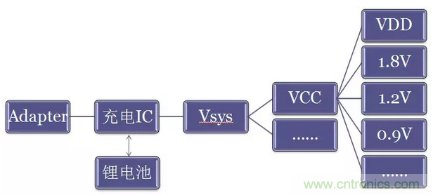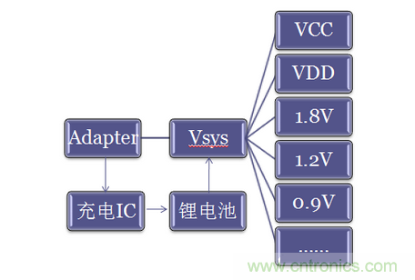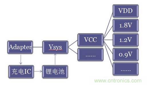 下圖為一般電源管理係統,原始分立電源管理係統,模型一: