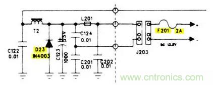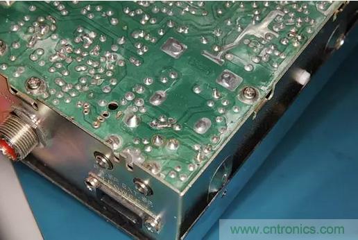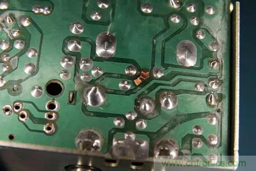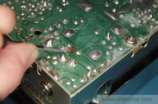 很hen自zi然ran地di,保bao險xian絲si會hui熔rong斷duan,但dan大da家jia又you不bu總zong是shi會hui用yong相xiang同tong額e定ding電dian流liu的de保bao險xian絲si來lai替ti換huan。通tong常chang情qing況kuang下xia,他ta們men會hui用yong更geng高gao額e定ding電dian流liu的de保bao險xian絲si來lai做zuo替ti換huan。所suo以yi,當dang收shou音yin機ji仍reng然ran反fan向xiang連lian接jie電dian源yuan,就jiu會hui出chu現xian保bao險xian絲si沒mei有you熔rong斷duan,PCB電路板上走線有燒斷的現象。如下圖所示。