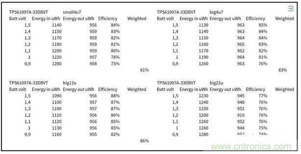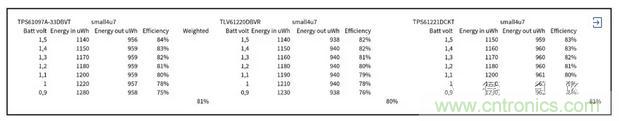 Otii工具讓效率計算變得非常簡單,隻需將輸出能量除以輸入能量即可,然後根據案例一測量設置中的說明對該效率值進行加權。圖5為所有三個DC/DC轉換器提供了一個概覽。