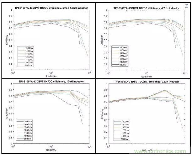 使用小型4.7μH片式電感器時,三個DC/DC轉換器的性能幾乎相同。為了繼續研究DC/DC,使用不同的電感器來了解效率是否有所提高。測試中選擇了三種不同的Bourns電感器和一種Murata電感器。