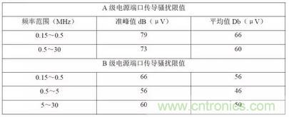 開關電源的傳導騷擾是通過電源的輸入電源線向外傳播的電磁幹擾。在開關電源輸入電源線中向外傳播的騷擾,既有差模騷擾、又有共模騷擾,共模騷擾比差模騷擾產生更強的輻射騷擾。傳導騷擾的測試頻率範圍為150KHz~30MHz,限值要求如下表1 所示:
