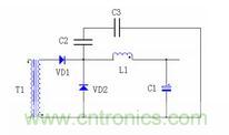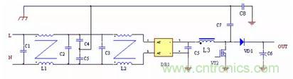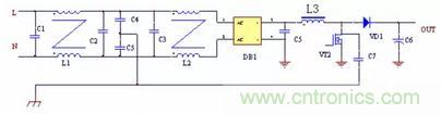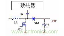圖中C2 是二極管VD1 和VD2 與散熱器之間的耦合電容,容量一般在幾十PF,C3 是增加的電容,C3 要遠大於C2,DC/DC 整流管、續流管上的電壓峰值經過C2 與C3 的分壓,幅度大大降低,就可以大大減小向外的輻射。
