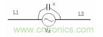 圖中,Vs 為騷擾源,對圖4 來說,就是開關管VT2 的D 極,L1、L2 相當於天線的兩個極,一個極是與開關管D 極相連的印製線,另外一個極是散熱器及與之相連的接地線,C是天線兩極之間的耦合電容,即圖4 中開關管與散熱器之間的耦合電容。