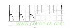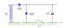 圖7 中,TI 是變壓器,VD1、VD2 分別是整流管和續流管,由於整流管、續流管在由導通轉向截止時有反向恢複電流,該反向恢複電流在VD1、VD2 兩端產生比較高的電壓峰值,由於快恢複二極管的反向恢複電流在幾十nS,所以峰值電壓的頻率較高,其基波頻率在幾十MHz,由於頻率很高,輻射能力很強,下圖8 是整流管和續流管的電壓波形。