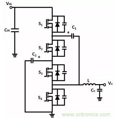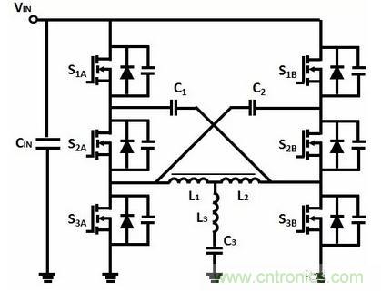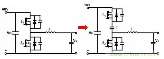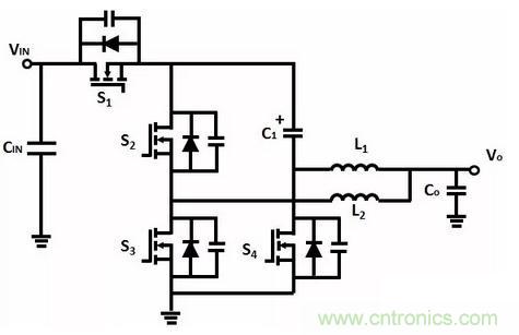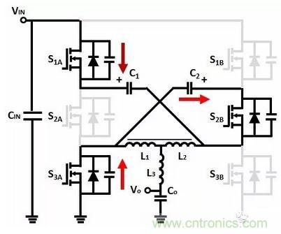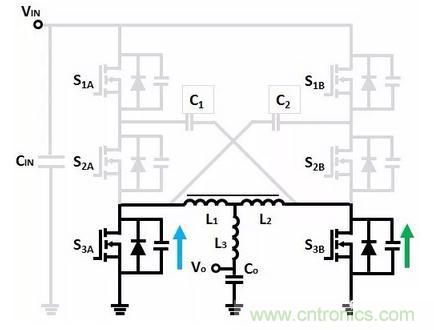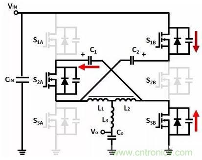 如果C1、C2的電容相等,電感電流等於電容C1、C2的電流之和。S1、S3工作於硬開關狀態,由於S1、S3的電流降低,因此可以同時降低導通損耗和開關損耗。