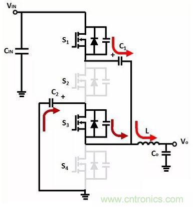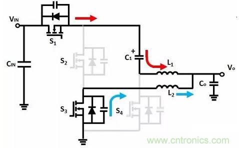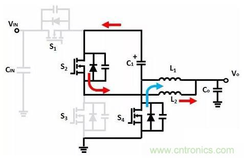 L1激磁,輸入電壓通過C1向輸出負載提供能量,同時對C1充電; L2去磁,S4續流。