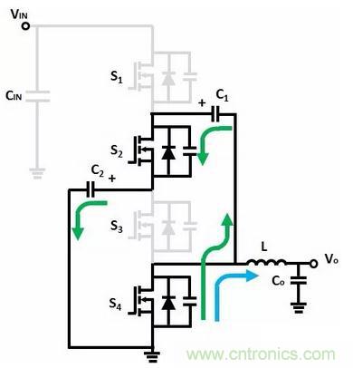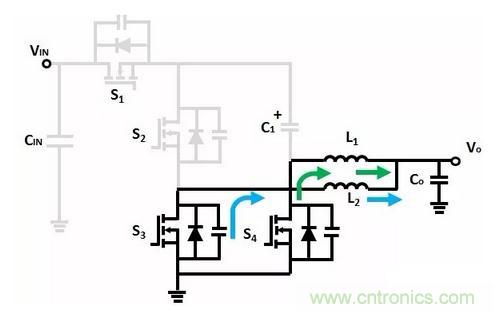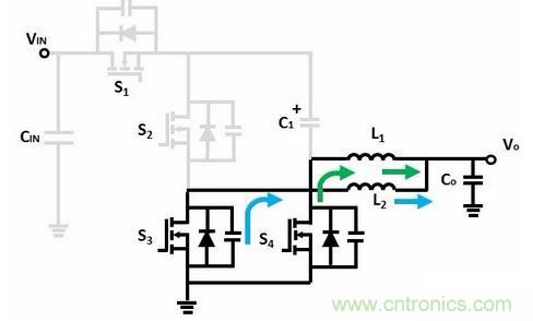 輸出電感去磁,在前麵一個階段過程結束時,由於C1、C2的電壓不平衡,當S2、S4導通後,將C1、C2並聯,所以電壓高的電容將會對電壓低的電容放電,那麼,S4不僅流過輸出電感續流電流,還要流過C1、C2充放電的電流,因此其導通損耗會增加。